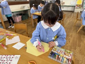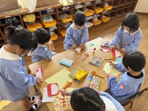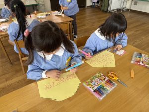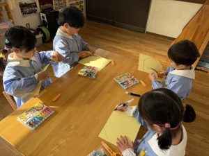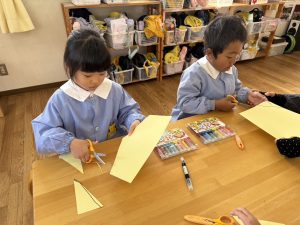 先生たちの絵馬を見た後はハサミを使って絵馬の形に切りました✨