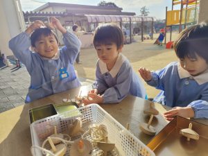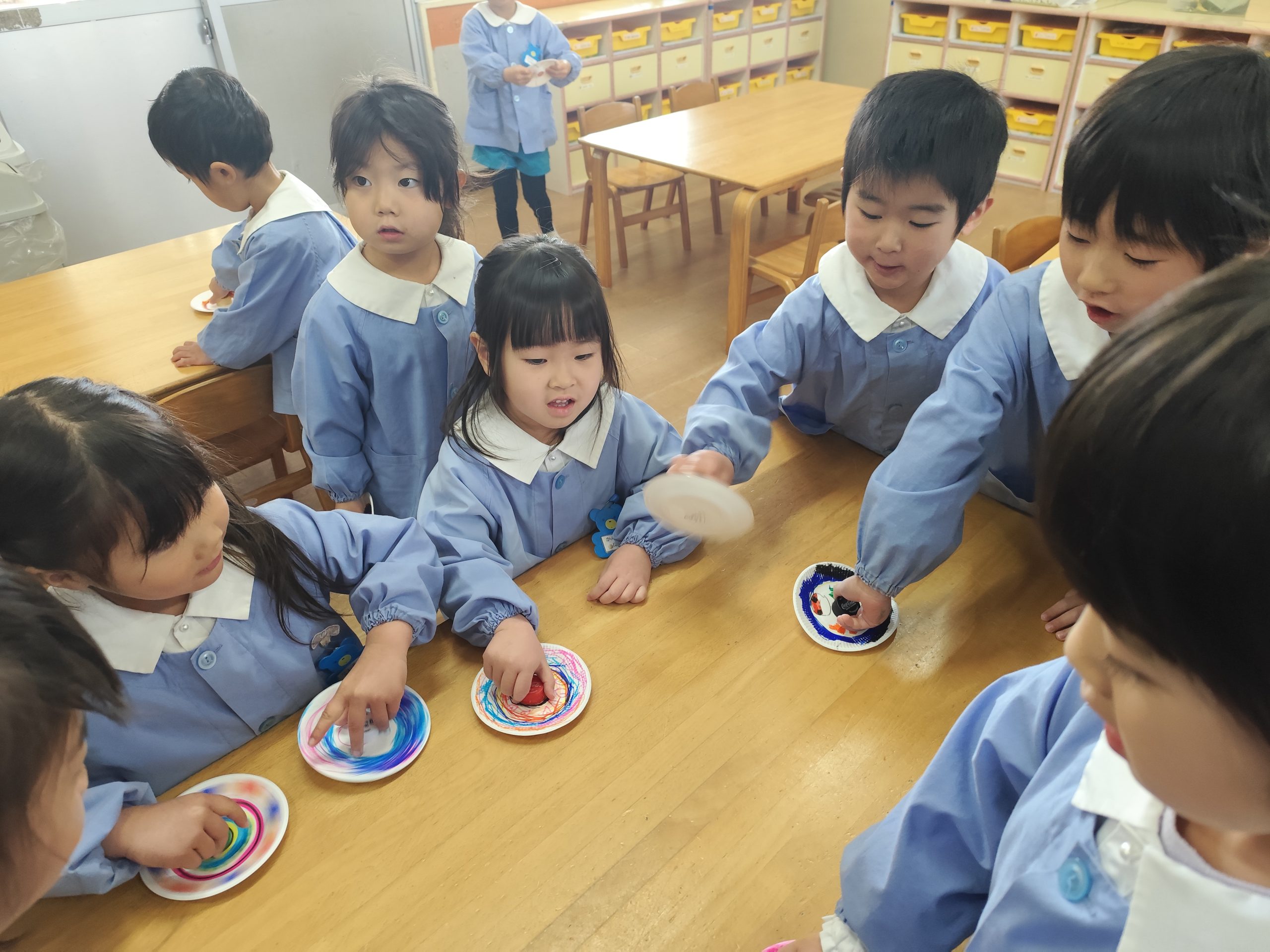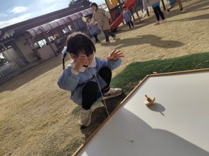 ばら組の保育室では、手作りのコマを作って回していますね。