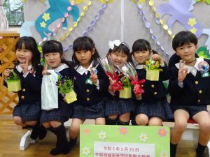 2023.03.27 / 最終更新日時 : 2023.03.27 postuser ブログ 卒園式 そつえんおめでとうございます 令和5年3月23日 第47回修了証書授与式を行いました。 子ども達の晴れの姿をたくさんの保護者の方々と一緒に厳粛な中にも 子ども達の喜びに満ちた式を行うことができました。 先生たちは、皆さんの自信に満ちた姿に成長を感じました。 これからも、「えがお・げんき・やさしさいっぱい」の皆さんでいてください。