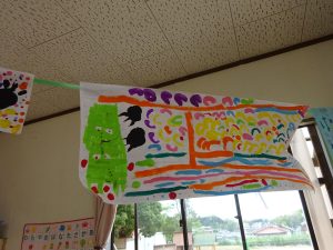 そこで、年長組では、グループを作り、絵の具や画用紙、テープ・シールなど