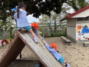 外あそびでは、三角屋根に登ったり、ボールで遊んだりしっかりと身体を動かしています✨