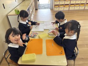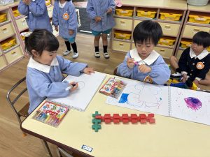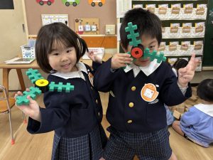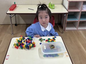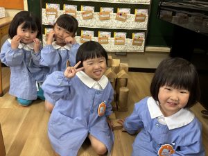 室内では、おままごとやボタン繋ぎ、ブロック、お絵描きなどを楽しんでいます♬