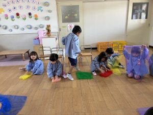 お部屋の中では、みんなで輪になって、スカーフを使ってリトミック遊び♬