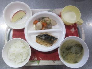 ごはん・焼き魚・里芋の煮物・味噌汁・リンゴ・牛乳