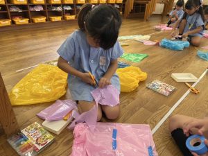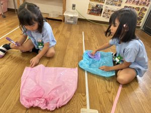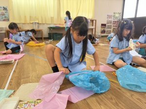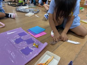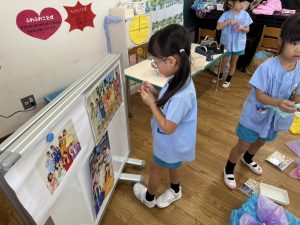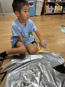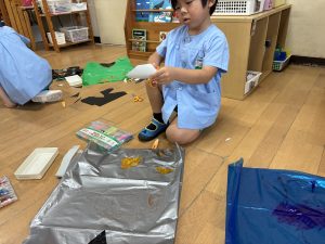 小さな手裏剣をくっつけたり、折り紙を交互に